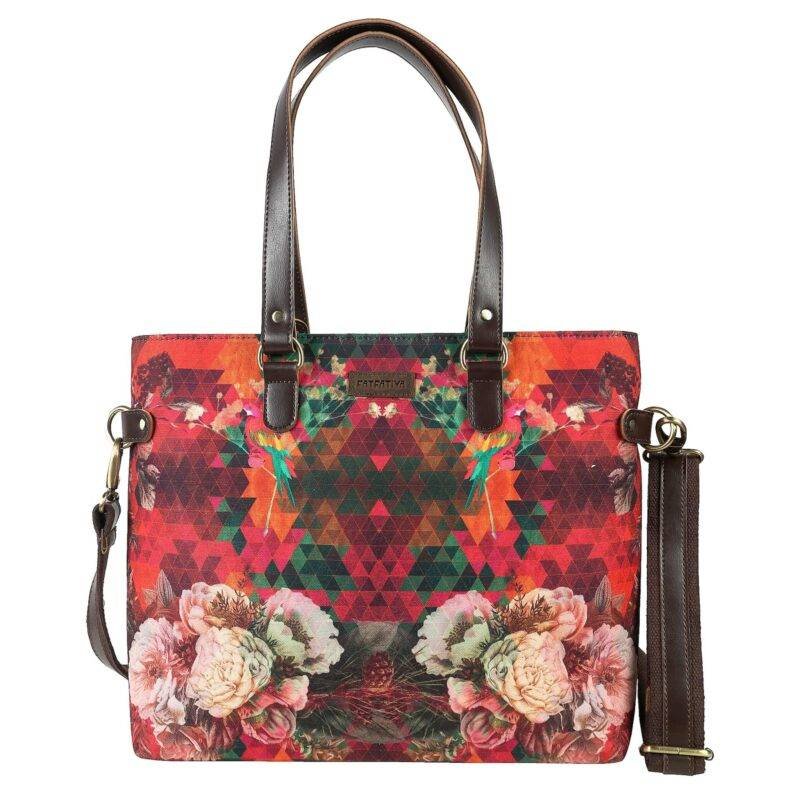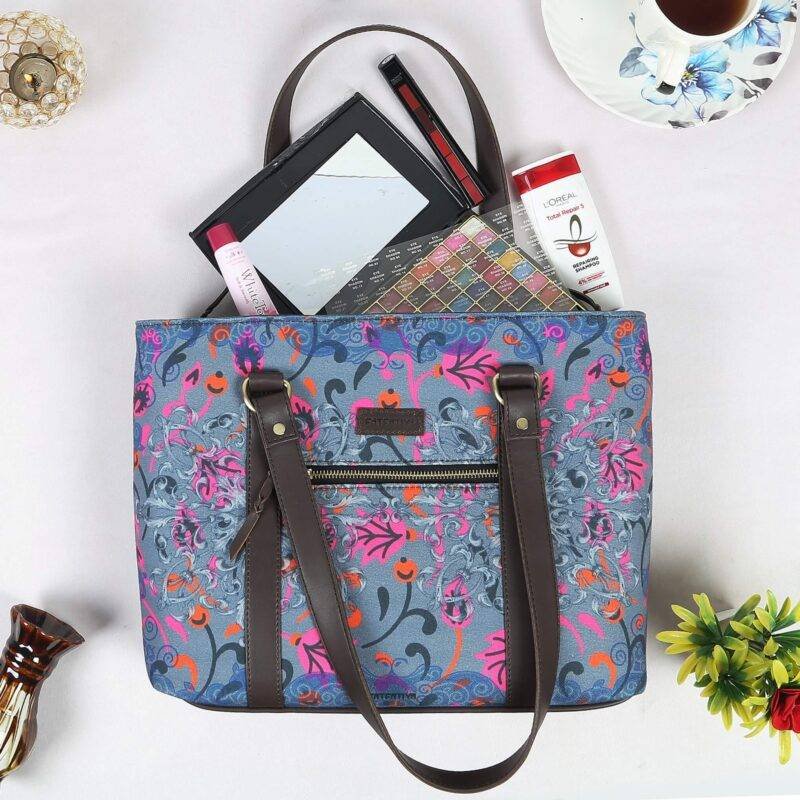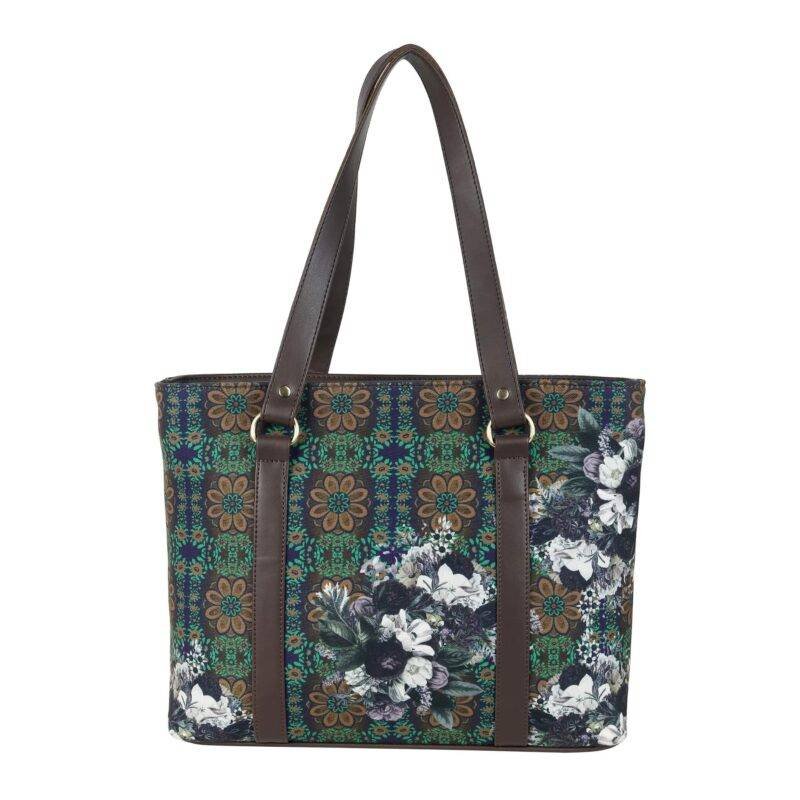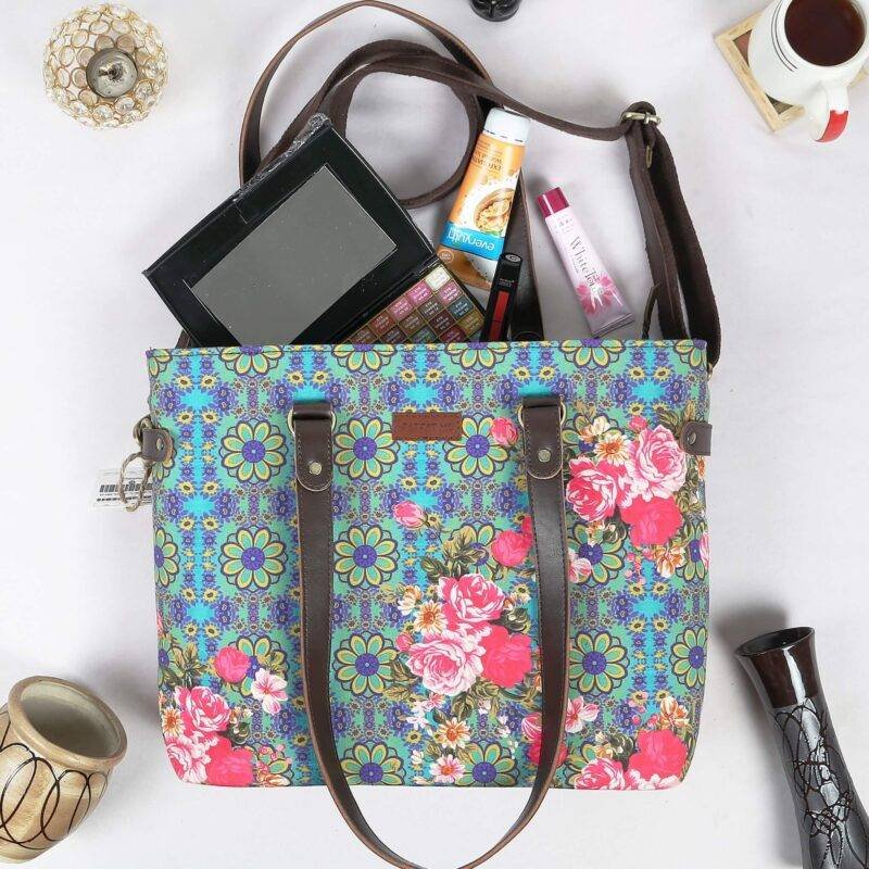 Add some floral flair to your outfit with our Floral Design Cool Tote Bag – the perfect blend of fashion and function. This tote bag with pockets is not only stylish, but it’s also super practical. With 2 zippered compartments to keep your valuables secure, a front zipper pocket for essentials, and 1 inside zipper pocket and 2 slip pockets for organization, it’s the ultimate on-the-go bag. And with its poly canvas and vegan leather material, it’s built to last. Don’t forget the adjustable shoulder strap for maximum comfort! Shop now for one of the best branded bags in India.