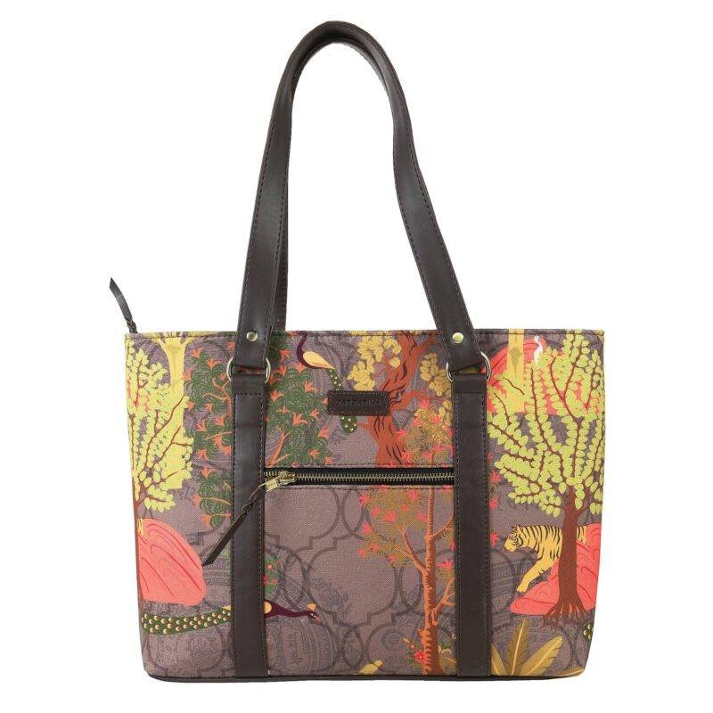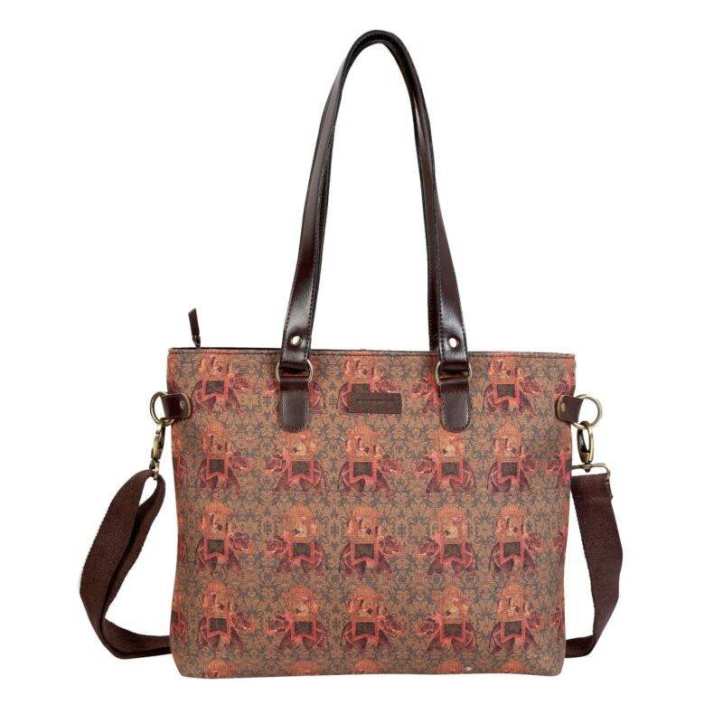 The Royal Alpha Printed Tote Bag has an elephant carrying a person print. The bag exudes authenticity with its sober background colours of green, brown, a touch of orange, and other colours. The bag has a positive aura. The bag has a traditional appearance, and if you want something to match your traditional attire, this elephant print bag is a good choice.