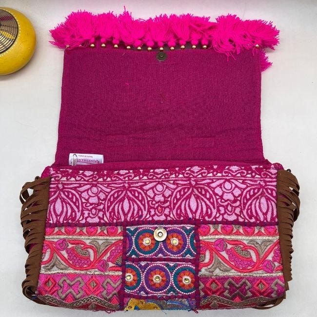 Introducing the BohoManjari Banjara Bag a handcrafted masterpiece blending traditional and modern embroidery. This spacious sling bag, adorned with intricate Rajasthani art, is perfect for weddings, festive parties, or everyday elegance. Elevate your look and personality with this unique accessory that complements both Indian and Western outfits.