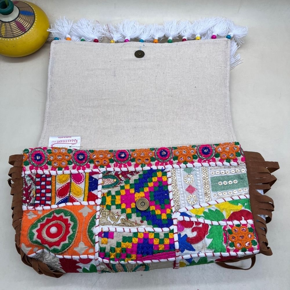 Introducing the Chandrika Loom Weave Banjara Bag a handcrafted masterpiece blending traditional and modern embroidery. This spacious sling bag, adorned with intricate Rajasthani art, is perfect for weddings, festive parties, or everyday elegance. Elevate your look and personality with this unique accessory that complements both Indian and Western outfits.