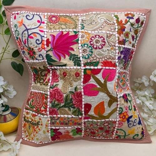 nfuse your living space with the timeless beauty of Rajasthan’s cultural heritage with this handcrafted cushion cover from Barmer. Created by skilled artisans using the traditional Khambadiya technique, the cover features a stunning blend of vintage embroidered patchwork that makes each piece unique, ensuring no two are exactly alike. The thick cotton lining on the back safeguards the intricate embroidery, allowing you to enjoy its charm for years to come.