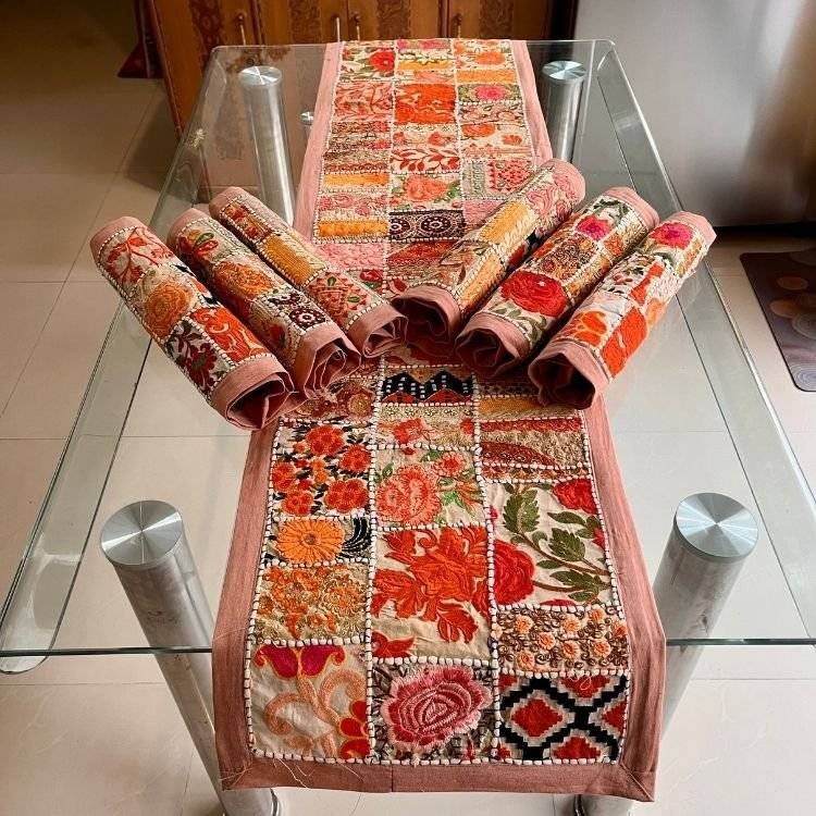 Khambadiya Patchwork Table Runner and Mat Set: Handcrafted Elegance from Barmer, Rajasthan