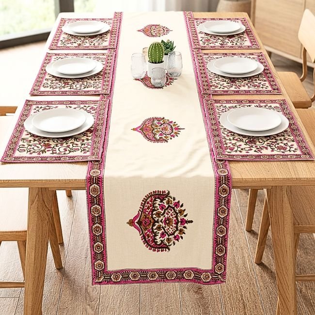 A complete luxury dining linen set featuring one handcrafted table runner and six matching placemats, designed to bring heritage elegance and visual harmony to your dining space.