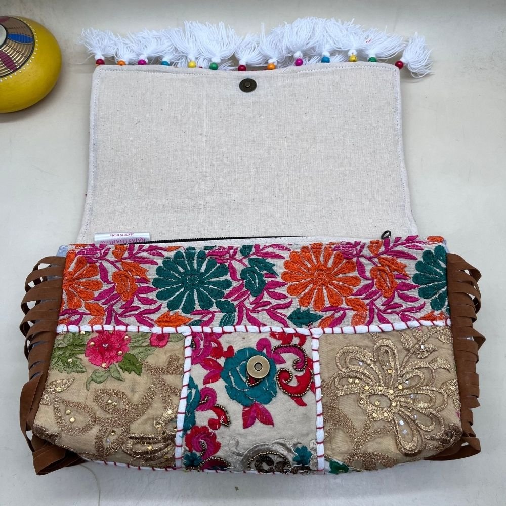 Introducing the GypsyRang Banjara Bag a handcrafted masterpiece blending traditional and modern embroidery. This spacious sling bag, adorned with intricate Rajasthani art, is perfect for weddings, festive parties, or everyday elegance. Elevate your look and personality with this unique accessory that complements both Indian and Western outfits.