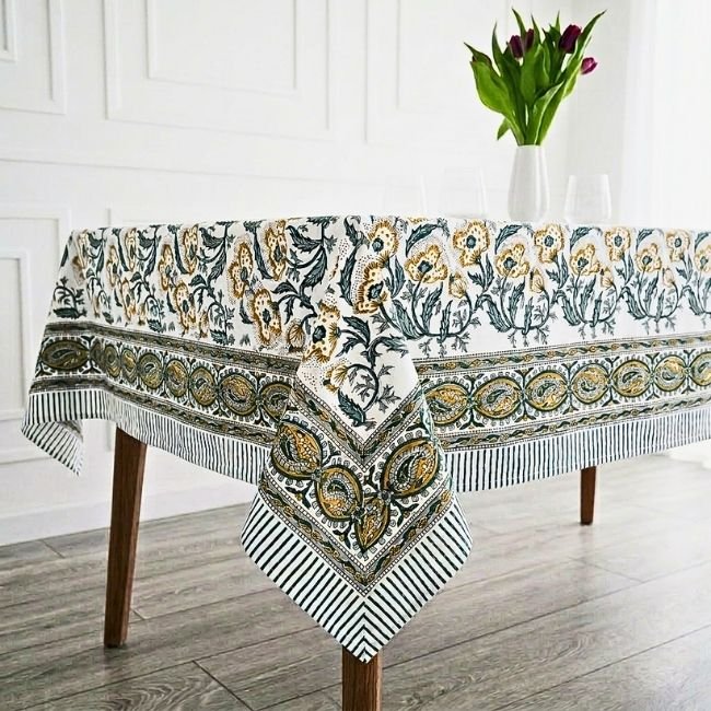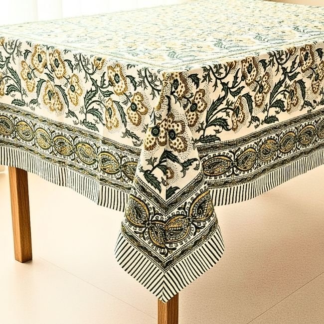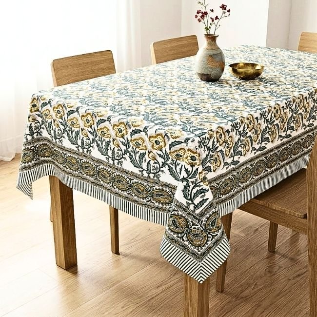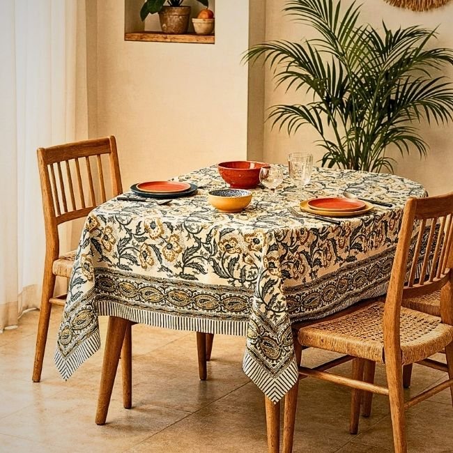 Hari-Baag Sanganeri Block Print Table Cover : Inspired by the courtyards of Rajasthan, this Sanganeri handblock printed Table Cover transforms everyday meals into warm, inviting experiences. Made from breathable cotton, it combines artisanal beauty with effortless practicality