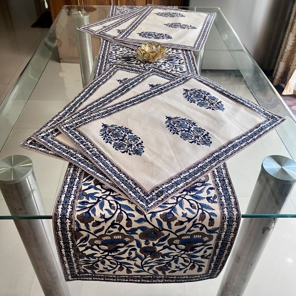 Create a dining experience inspired by timeless Indian craftsmanship with the Neel Darbar Buti 7-Piece Dining Table Set. Thoughtfully curated to bring balance and refinement, this coordinated set includes one table runner and six matching placemats, each hand block printed by skilled artisans.