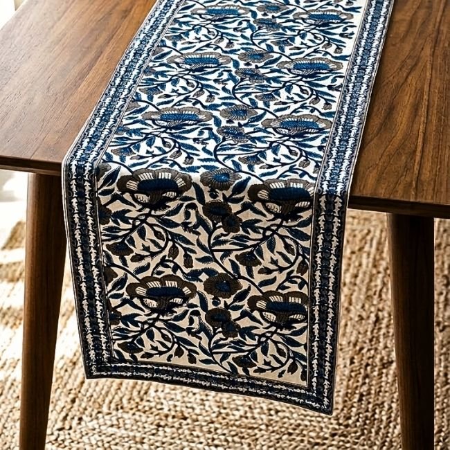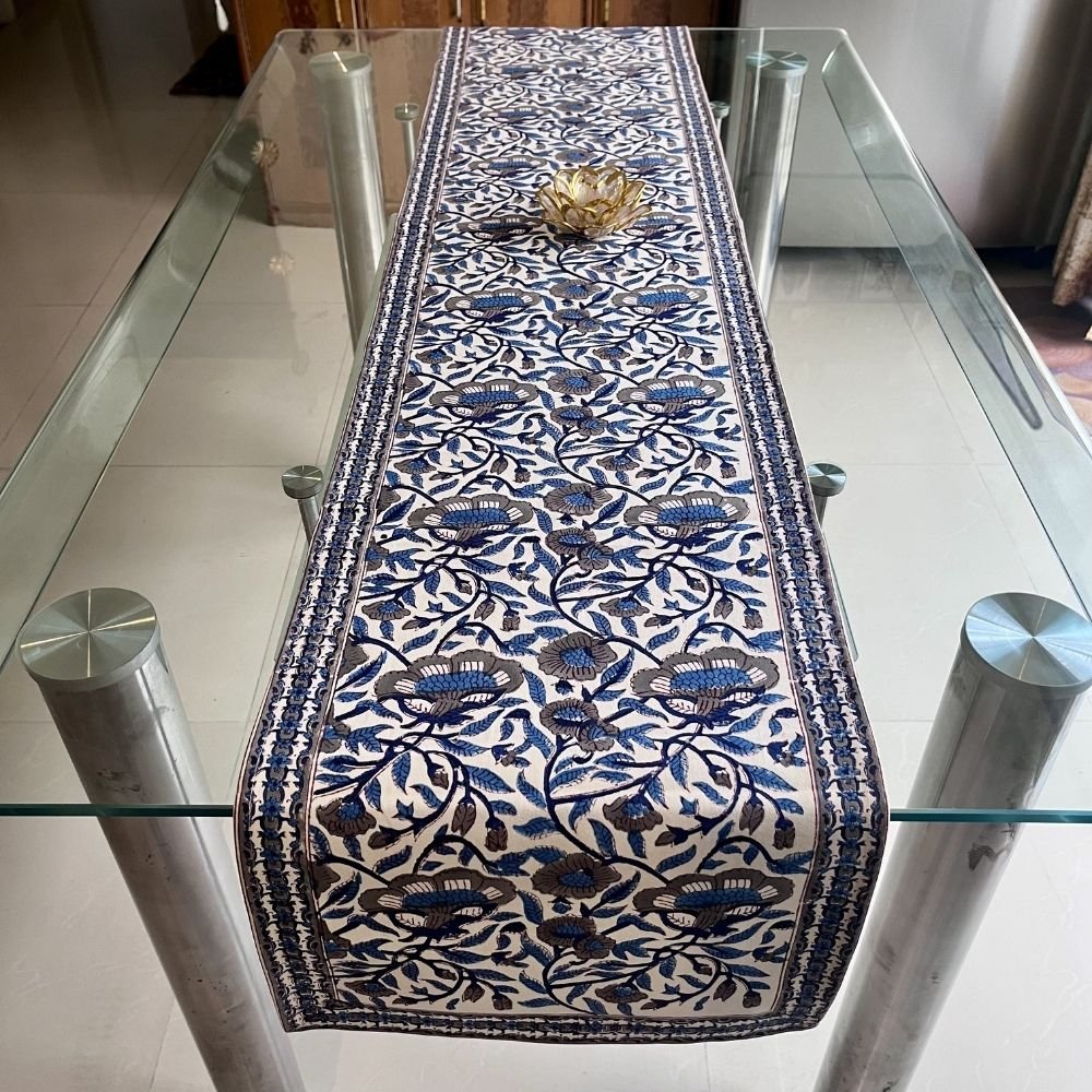 A timeless indigo hand block printed table runner inspired by heritage floral jaals, crafted in soft cotton to bring understated luxury to everyday dining.