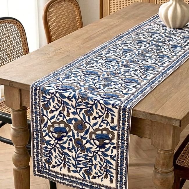 Printed on breathable cotton, this runner embodies quiet sophistication. The rich blue hue evokes calm monsoon skies, while the intricate motifs celebrate India’s artisan heritage.