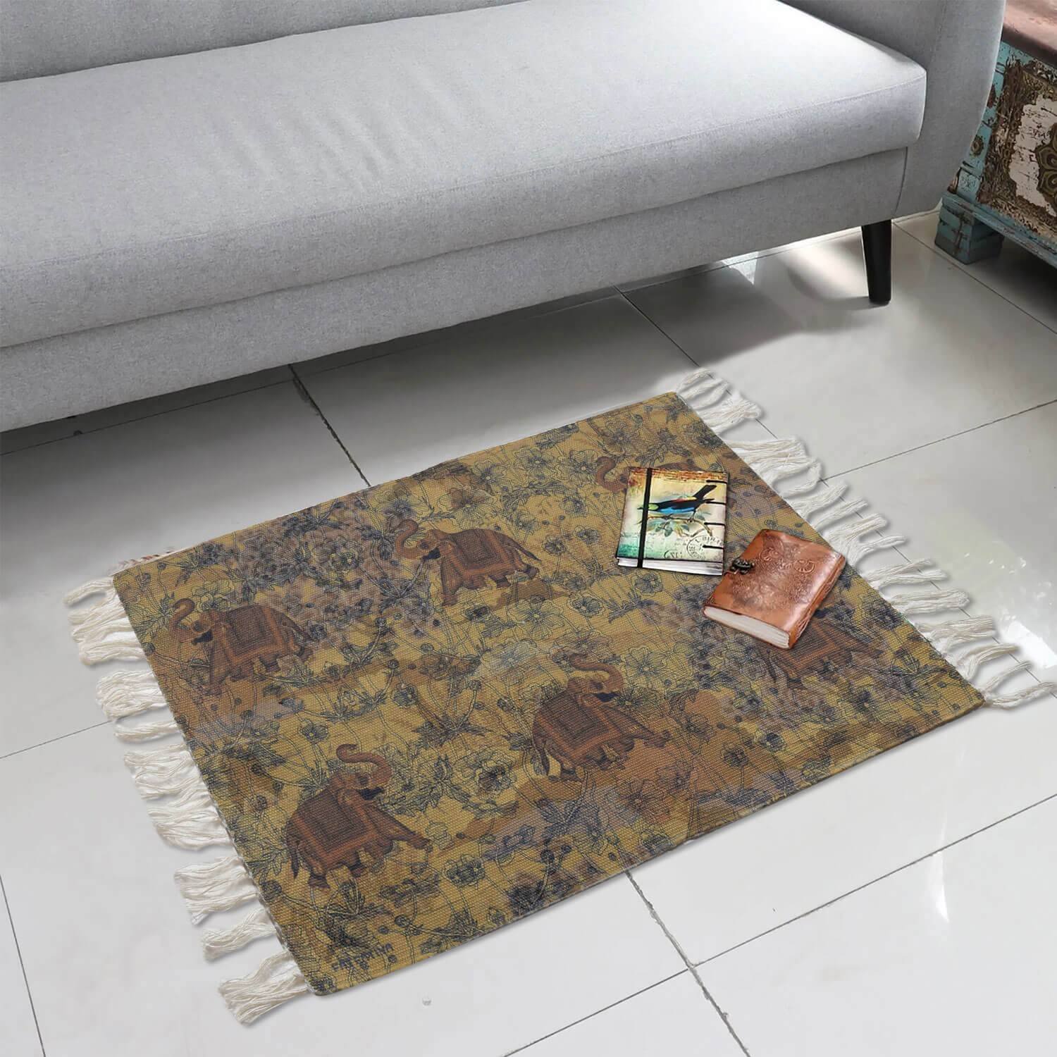 Jaipuri Ele Modern Living Room Rug transforms your living spaces with the majestic, a captivating collage of regal elephants amidst a lush jungle, adding an enduring touch of grace to your home.