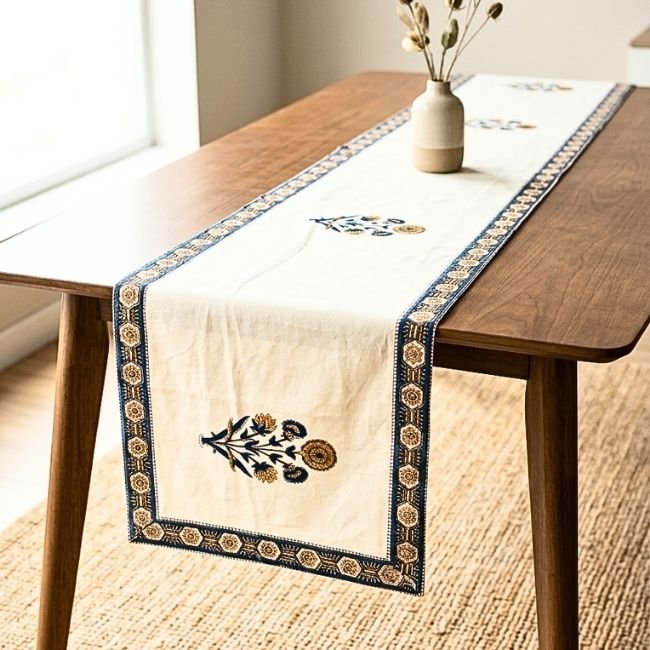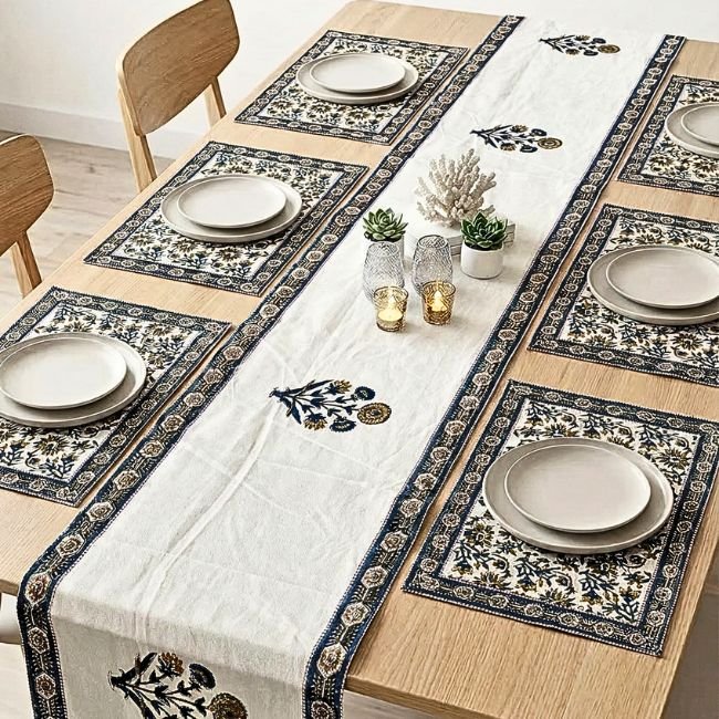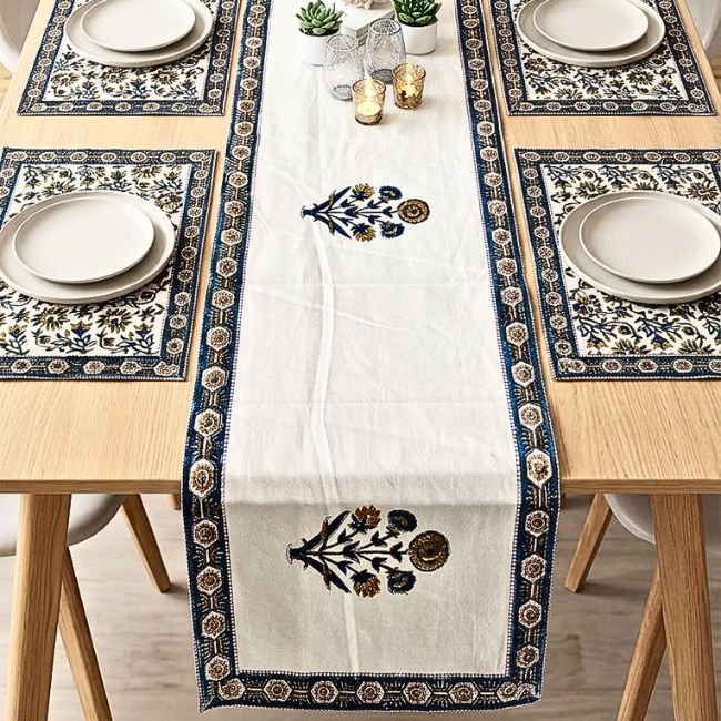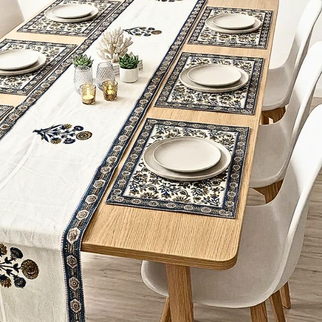 Inspired by traditional palace textiles, the motifs reflect centuries of design heritage, while the rich indigo palette adds depth and sophistication to your dining table.