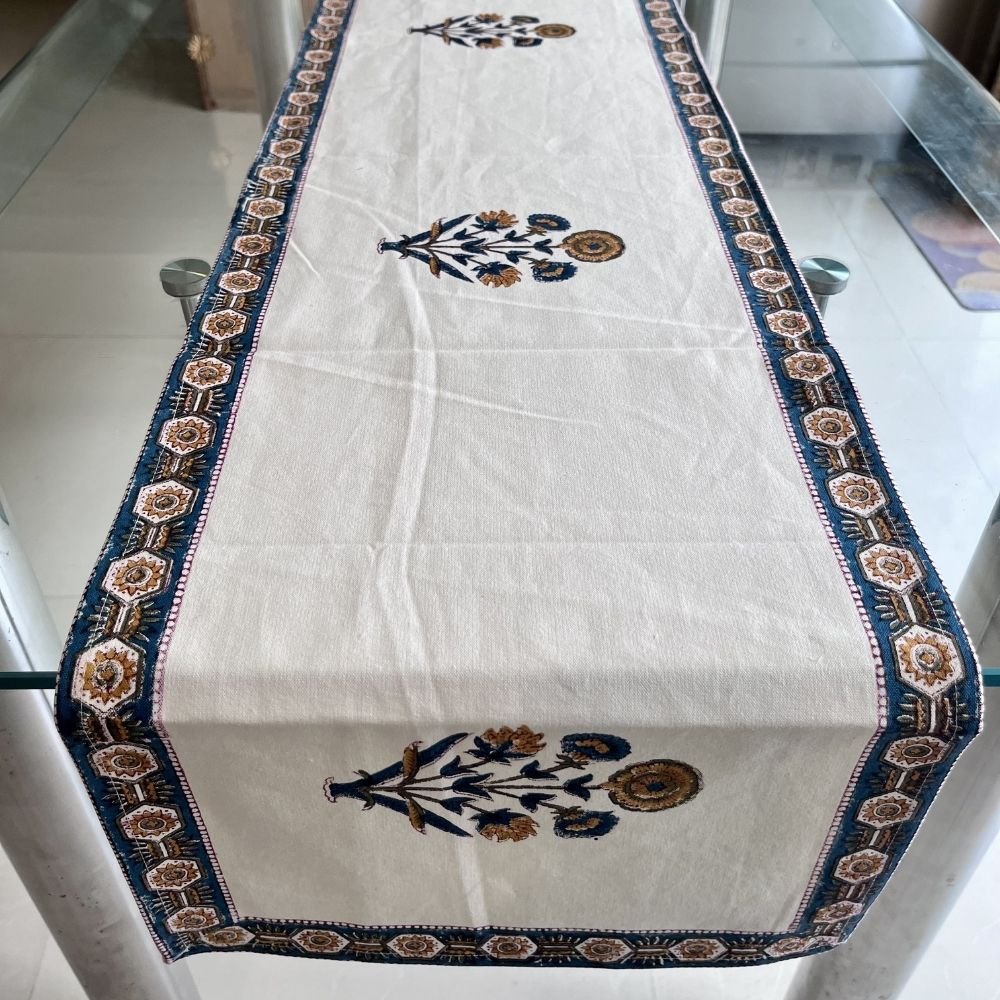 Create a dining experience inspired by timeless Indian craftsmanship with the Neel Darbar Buti 7-Piece Dining Table Set. Thoughtfully curated to bring balance and refinement, this coordinated set includes one table runner and six matching placemats, each hand block printed by skilled artisans.