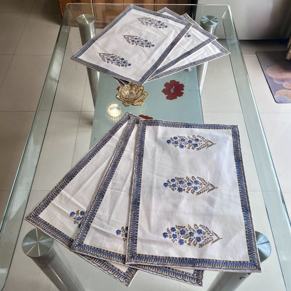 Rooted in India's rich textile legacy, the Neel Darbar Buti Dining Placemats reflect the quiet elegance of royal living. Inspired by intricate buti motifs once seen in palace textiles, each placemat is hand block printed by skilled artisans who carry forward generations of craftsmanship.
