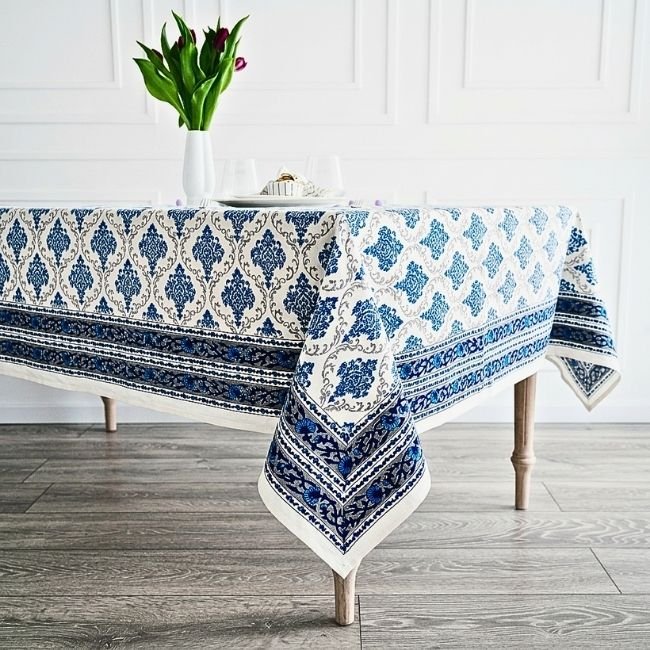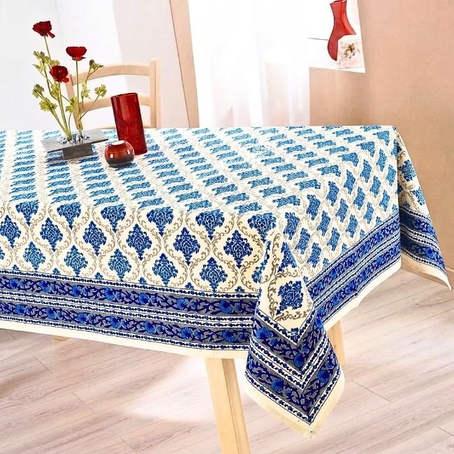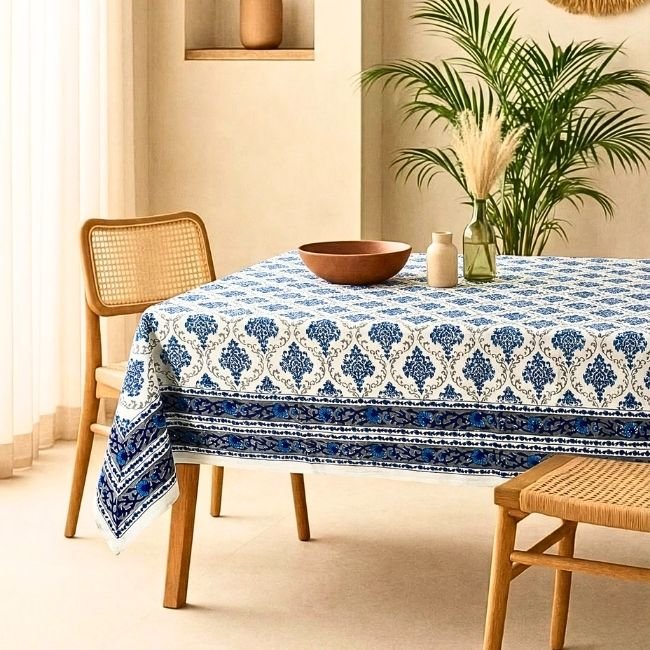 Neel Sarovar Block Print Table Cover : Inspired by the courtyards of Rajasthan, this Sanganeri handblock printed Table Cover transforms everyday meals into warm, inviting experiences. Made from breathable cotton, it combines artisanal beauty with effortless practicality