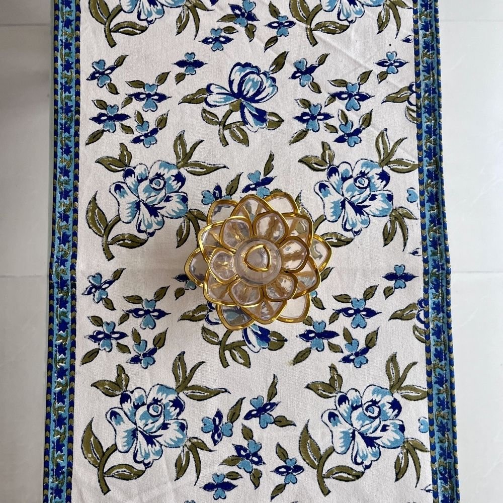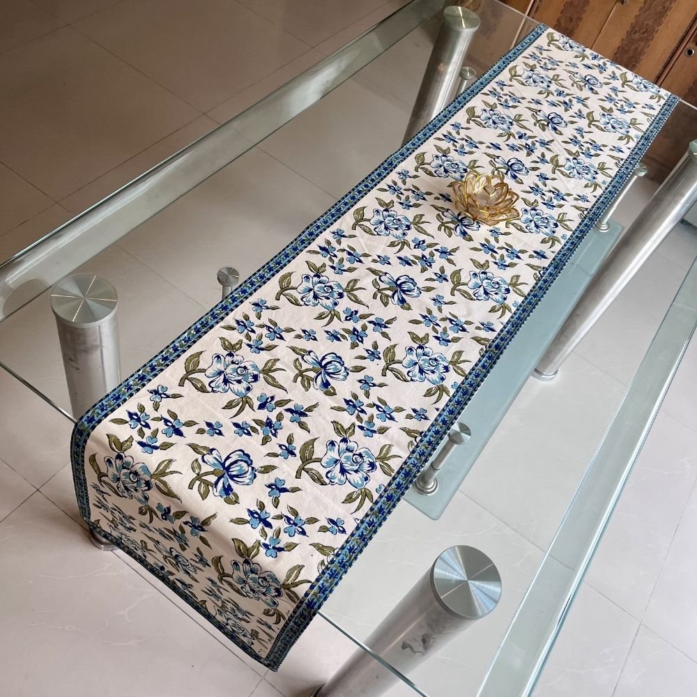 The Neelkamal Vatika Hand Block Printed Cotton Table Runner draws its inspiration from the quiet beauty of gardens where early morning sunlight catches the dew on blue petals. Rendered in rich indigo hues, this handcrafted table runner makes every dining moment feel serene and thoughtfully curated.