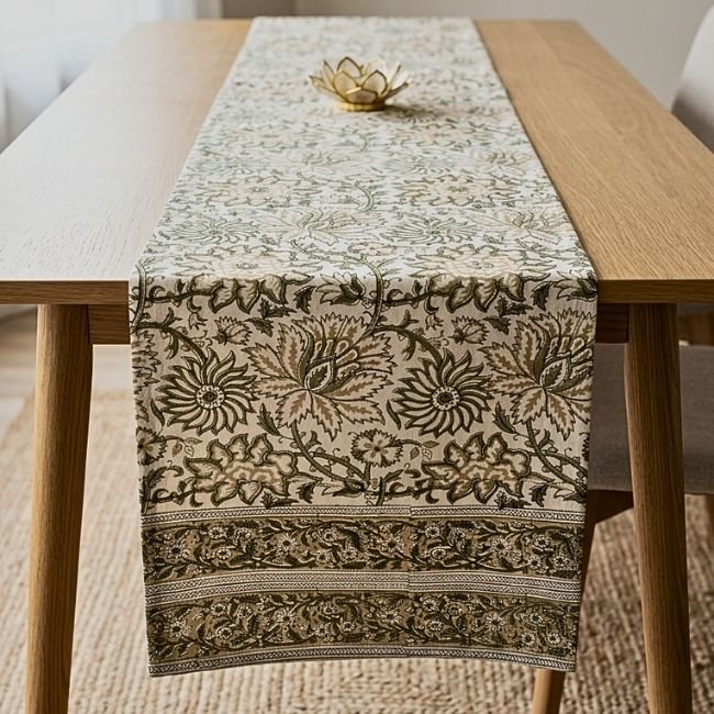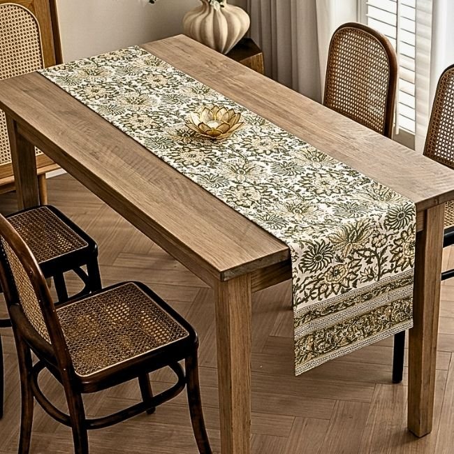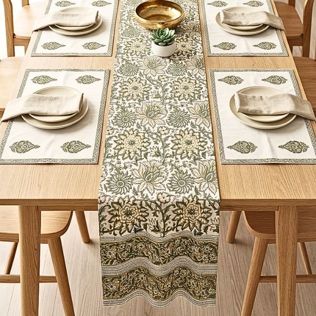 A complete luxury dining linen set featuring one handcrafted table runner and six matching placemats, designed to bring heritage elegance and visual harmony to your dining space.