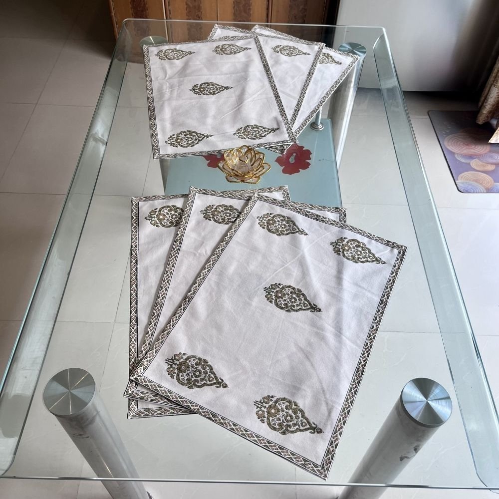 Elevate your dining ritual with handcrafted cotton placemats featuring heritage-inspired motifs. Designed for both protection and elegance, these luxury placemats bring timeless sophistication to everyday meals and special gatherings.