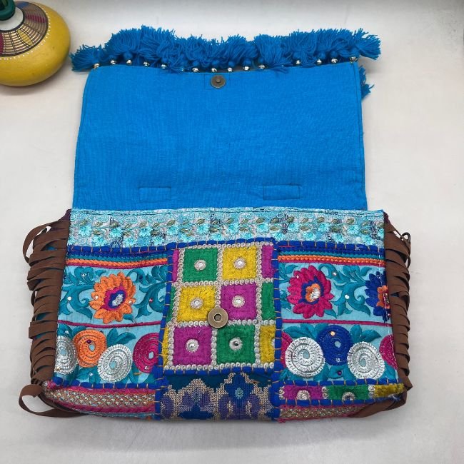 Introducing the Patang Path Banjara Bag a handcrafted masterpiece blending traditional and modern embroidery. This spacious sling bag, adorned with intricate Rajasthani art, is perfect for weddings, festive parties, or everyday elegance. Elevate your look and personality with this unique accessory that complements both Indian and Western outfits.