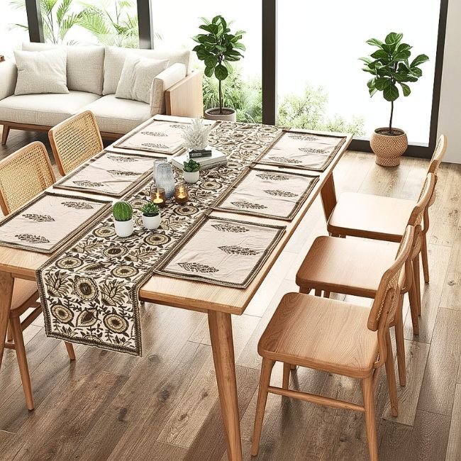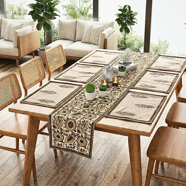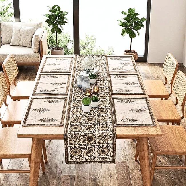 Featuring one coordinating runner and six matching placemats, this set offers visual harmony and artisanal authenticity. The subtle brown floral butas create warmth without overpowering your decor.