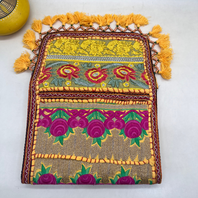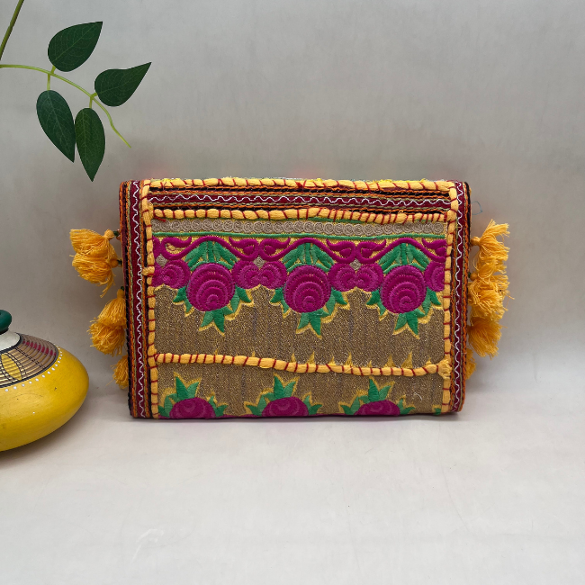 Step into a world of color and craftsmanship with the banjara sling bag, a handmade sling bag that effortlessly enhances your style quotient. This beautiful bag features intricate patchwork and embroidery designs, crafted with different colorful threads on both sides, making it a true work of art.