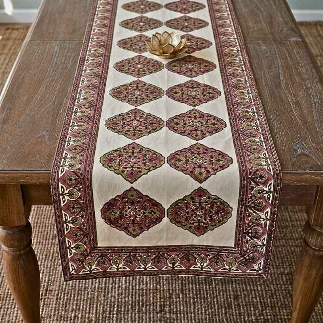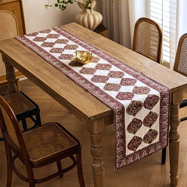 Rendered in luxurious rani pink, this runner stands between festive joy and everyday grace. The breathable cotton blend provides a comfortable structure while highlighting the beauty of the hand block print, whether styled for a family brunch or a celebratory dinner.