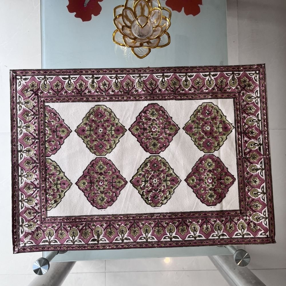The structured jaal design reflects traditional palace latticework, while the bold pink hue creates a lively dining atmosphere. Hand block printed on soft cotton, these placemats bring energy and elegance together.