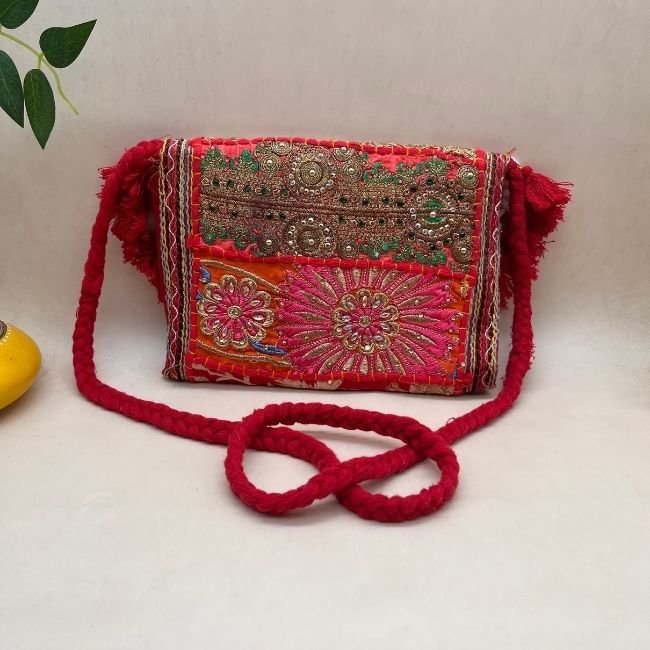 Step into a world of color and craftsmanship with the banjara sling bag, a handmade sling bag that effortlessly enhances your style quotient. This beautiful bag features intricate patchwork and embroidery designs, crafted with different colorful threads on both sides, making it a true work of art.