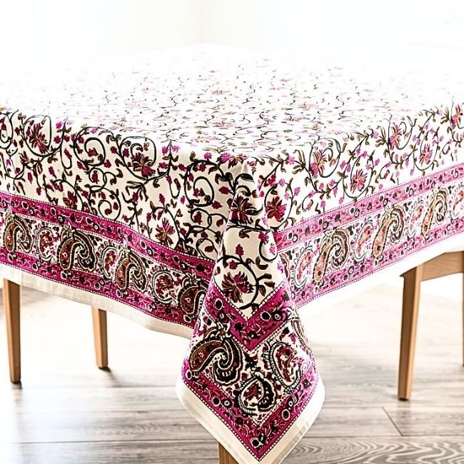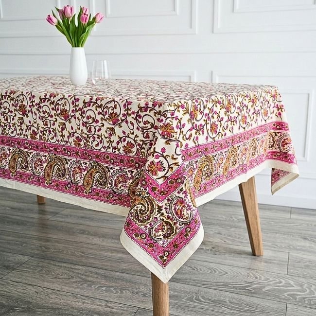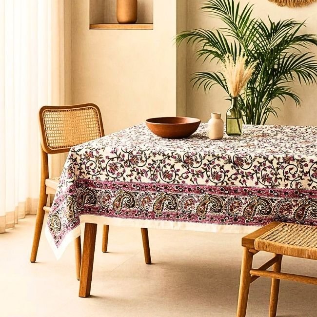Rangrez Gulabi Block Print Table Cover : Inspired by the courtyards of Rajasthan, this Sanganeri handblock printed Table Cover transforms everyday meals into warm, inviting experiences. Made from breathable cotton, it combines artisanal beauty with effortless practicality