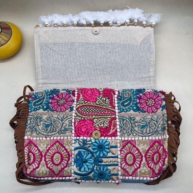 Introducing the Satrang Mahal Banjara Bag a handcrafted masterpiece blending traditional and modern embroidery. This spacious sling bag, adorned with intricate Rajasthani art, is perfect for weddings, festive parties, or everyday elegance. Elevate your look and personality with this unique accessory that complements both Indian and Western outfits.