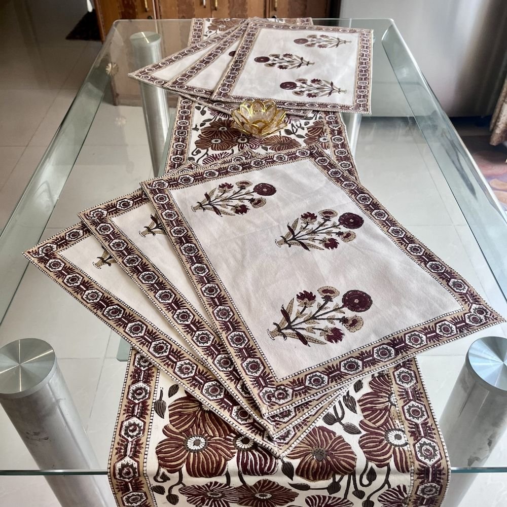 A complete luxury dining linen set featuring one handcrafted table runner and six matching placemats, designed to bring heritage elegance and visual harmony to your dining space.